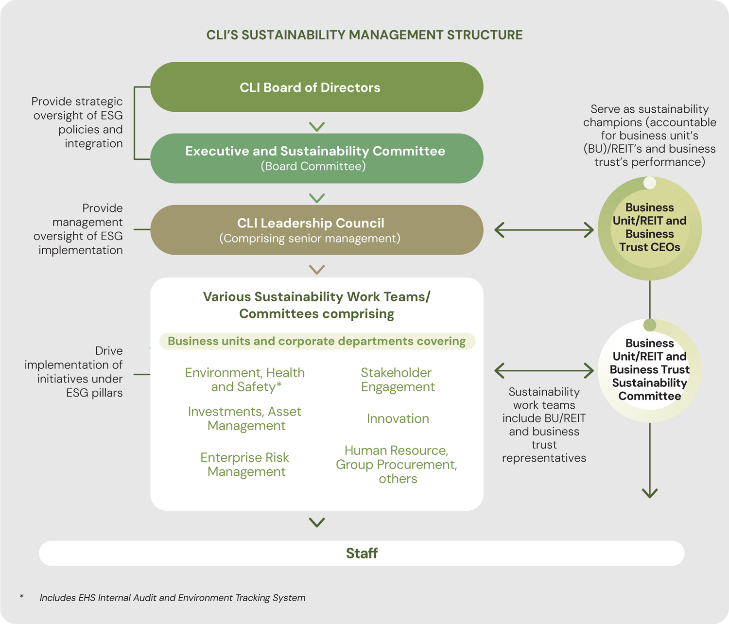 These updates are in relation to sustainability risks, and relevant performance metrics, which include carbon emissions performance, progress on achieving the reduction targets, green certification, human capital development, as well as stakeholders' expectations on climate change and/ or other social matters. The Sustainability Department works closely with key members from various departments including finance, investment and portfolio management, as well as operations department and technical teams of CLI in carrying out strategies and relevant activities, abiding by CLI's sustainability framework and policies. The Property Managers have an EHS Committee and an Engineering, Systems and Sustainability team whose role includes integrating sustainability into operations.