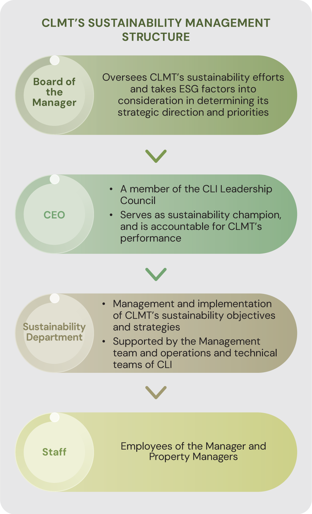 A Sustainability department led by the CEO of the Manager oversees sustainability objectives and strategies directly to ensure greater focus on sustainability and climaterelated matters for CLMT. The Sustainability Department is responsible for providing timely and regular updates on CLMT's sustainability matters and progress report on 2030 SMP to the Board of the Manager.
