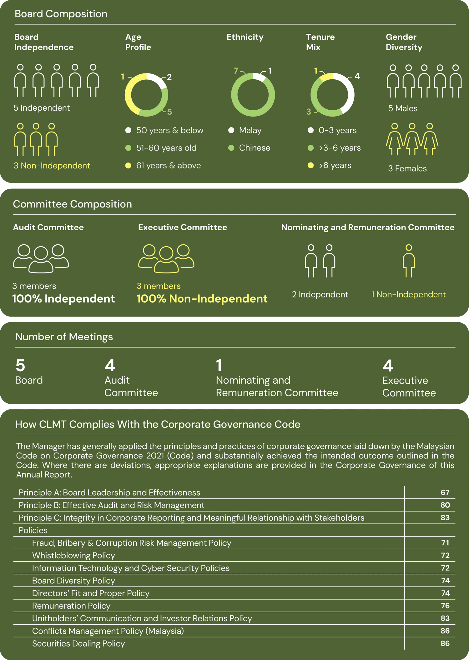 The Board of the Manager of CLMT is responsible for overseeing CLMT's sustainability efforts, and takes ESG factors into consideration in determining its strategic direction and priorities. The Board also approves the executive compensation framework based on the principle of linking pay to performance. The Manager's business plans are translated to both quantitative and qualitative performance targets, including sustainable corporate practices and are cascaded throughout the organisation.